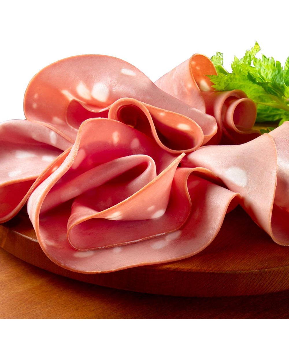 Eine Mortadella mit starkem Geschmack und intensivem Aroma. Rosa Scheibe mit grünen Pistazien.