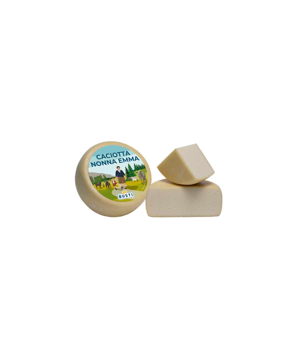 Einfacher und echter Frischkäse, hergestellt aus pasteurisierter Vollmilch von Kuh und Schaf. Das erste Rezept der Molkerei stammt aus dem Jahr 1955 und trägt den Namen von Remo Bustis Mutter Emma. Die Rinde hat eine helle elfenbeinfarbene Farbe und ist sehr dünn. Der ins Strohgelb tendierende Teig zeichnet sich durch eine elastische, zarte und weiche Textur aus und weist kleine, vereinzelte Löcher auf. Aufgrund seines süßen und buttrigen Geschmacks wird er auch von den anspruchsvollsten Gaumen sehr geschätzt. Wertvoller Verbündeter in der Küche wegen seiner vielfältigen Verwendungsmöglichkeiten, von kalten bis zu heißen Rezepten, bei denen er extrem leicht schmilzt. Hervorragend geeignet, um heißen Vorspeisen Cremigkeit zu verleihen und leckere Sandwiches zu ergänzen. Auch mit alternativem Grafiketikett erhältlich: Caciotta Toscana.