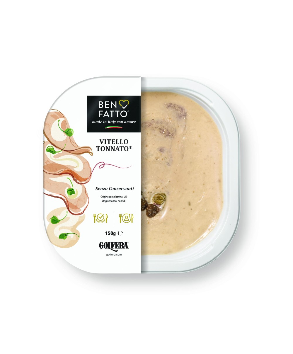 Precious Italian veal medallion cooked and boiled, and when cold, sliced thinly. Finally, it is covered by a sauce, made with tuna of the highest quality and mayonnaise from Italian eggs of on the ground raised hens, capers and anchovies. Vitello tonnato is the cold dish of the traditional Italian cuisine. Handmade. Fresh. Preservative free. Practical packaging. Innovative: Vacuum sealed and cold pasteurised in order to maintain its fresh character and its organoleptic properties. A new fully recyclable tray, respecting the environment. Golfera also highlights on the label the choice of a new 100% recyclable tray. Designed for restaurateurs and operators seeking a solution to deliver high-end gourmet dishes while maintaining fast and efficient service.