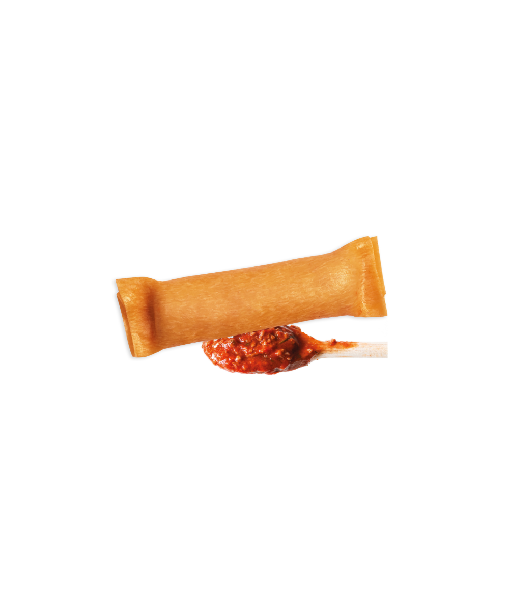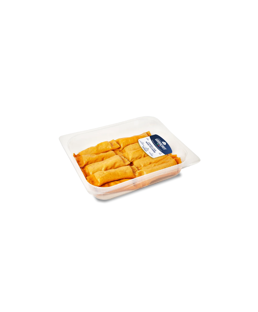The meat ragout Cannelloni made by Fontaneto are particularly large and cylindrical ravioli with fresh eggs, stuffed by hand, with a cylindrical and red dough that is firm to the touch and to chew. Their filling has an unmistakable taste of meat ragout. Suitable for those who want to prepare an original and tasty first course. Here, they are sold in 1 kg packages in a protective atmosphere. Store between +4° and +6°C. After opening the packaging, consume the product within 3 days. Do not puncture the packaging. Cooking time: in the oven with water and butter for 15 minutes at 200 degrees or with bechamel for 30 minutes at 180 degrees (like a lasagna).