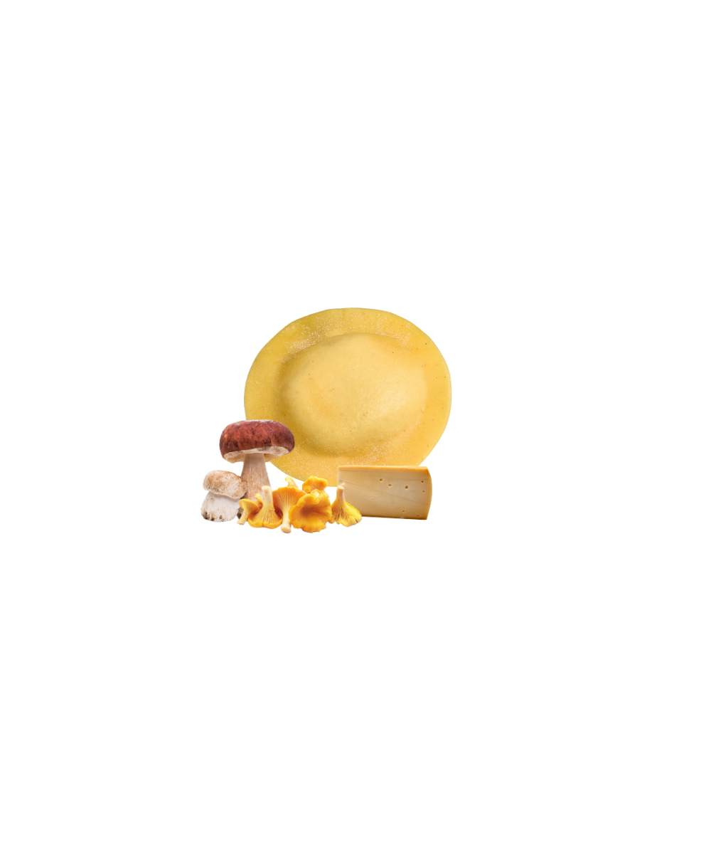 Pasta (45%): durum wheat semolina, eggs (20% in the pasta; 9% of the total), soft wheat flour, water. Filling (55%): ricotta (whey, salt), breadcrumbs (soft wheat flour type "0", brewer's yeast, salt), water, mushrooms (13.1% of the filling; 7.2% of the total) [Boletus edulis (6.6% of the filling; 3.63% of the total), Cantharellus cibarius (6% of the filling; 3.3% of the total)], whey powder, Asiago PDO (8% of the filling; 4.4% of the total) (milk, salt, rennet), sunflower seed oil, onions, salt, vegetable fiber, parsley, white wine, flavorings, natural flavoring, sugar, garlic, pepper, preservative: E200.