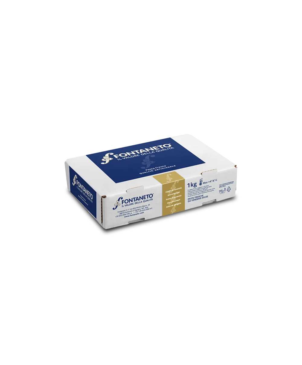 Les pâtes fraîches FONTANETO sont les pâtes made in Italy idéales pour les restaurants et les épiceries fines du monde entier intéressés à offrir des pâtes gastronomiques à leurs clients. Les ingrédients de la cuisine méditerranéenne et l'amour et l'engagement à créer des pâtes font d'un simple plat de pâtes un succès garanti. Une large gamme de produits est disponible: Tagliatelles, Tagliolini, Agnolotto, Cappelletti, Ravioli, Saccottino, Tortellini, Lasagna, Gnocchi, Cavatelli, Cortecce, Fusilli, Orecchiette, Paccheri, Scialatielli, Strascinati, Strozzapreti, Trofie ... avec différents types de farcies au fromage (Grana Padano, Parmigiano Reggiano, Pecorino, Burrata, Mozzarella, Ricotta), légumes de saison (ail sauvage, artichauts, pissenlits, basilic, asperges, courgettes, noix, feuilles de navet), champignons (cèpes, truffes, chanterelles), de la viande (bœuf, porc) et du poisson (caviar, bar, espadon, crevette). Une large gamme de raviolis végétariens est disponible. Les sauces simples et le pesto se marient parfaitement avec tout l'assortiment.