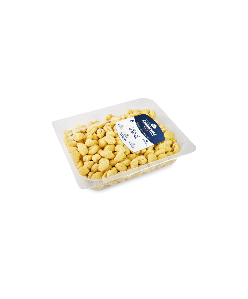Les gnocchis Rigati produits par Fontaneto sont des gnocchis de pommes de terre à base de farine de blé tendre, d'amidon de maïs et de farine de blé. Ici, ils sont disponibles au format de 2 kg, doivent être conservés dans un endroit frais et sec et doivent être consommés dans les 14 jours. De plus, le temps de cuisson n'est que de 1 minute!Les gnocchis Fontaneto sont aussi bons que ceux faits maison, grâce à la saveur et à la qualité des pommes de terre farineuses utilisées. Un plat typiquement italien, qui donne aux clients un réel plaisir à les déguster. Grâce à leur polyvalence, ils peuvent être combinés avec les condiments les plus disparates : de la classique sauce tomate et basilic, au pesto génois ; de la sauce bolognaise à la viande, à la crème aux quatre fromages ; de la sauce Boscaiola, à la sauce Sorrentina. Ou encore, ils se marient très bien avec la saveur du potiron et du saucisson, du gorgonzola et de la pancetta, des aubergines et des courgettes.Commandez dès maintenant les gnocchi rigati fabriqués par Fontaneto : NATURALEITALIANO s'engage à livrer le produit dans les 48 heures dans le monde entier.