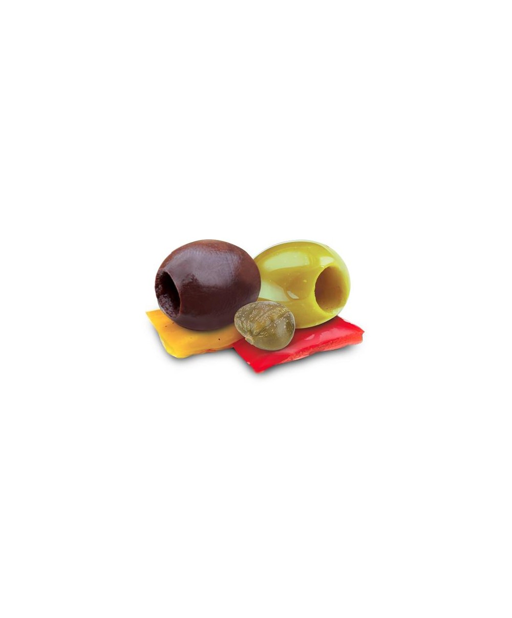 Olives vertes et noires dénoyautées en proportions variables, huile de tournesol, poivrons rouges et jaunes, câpres, sel, épices, vinaigre de vin blanc, correcteurs d'acidité : acide lactique et acide citrique, antioxydant : acide ascorbique