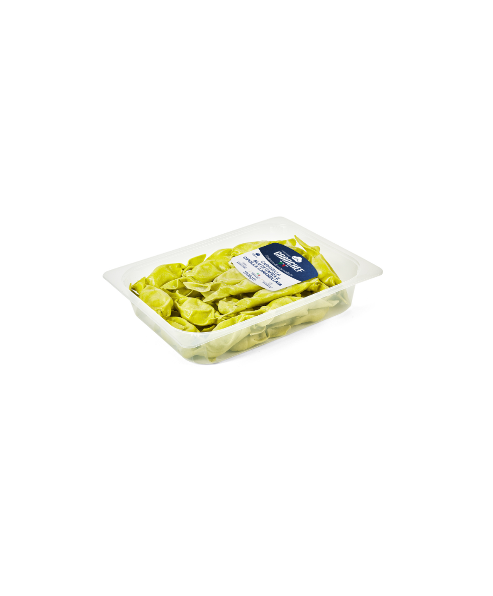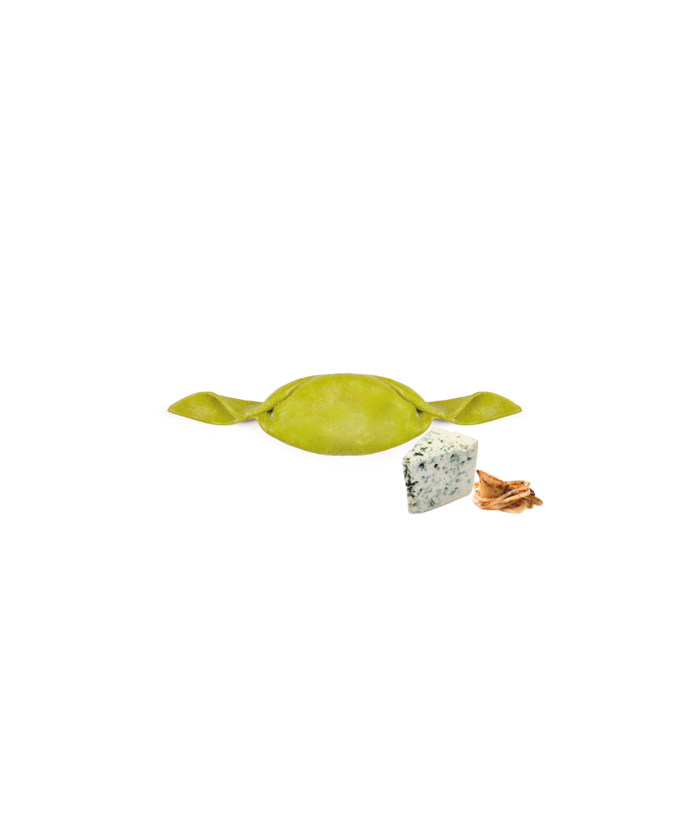Pasta (50%): semola di grano duro, farina di grano tenero, uova da allevamento a terra (20% sulla pasta; 10% sul totale), acqua, sale, spinaci disidratati (1% sulla pasta). Ripieno (50%): ricotta (siero di latte, latte, sale), formaggio Blu di Capra (33% sul ripieno; 16,5% sul totale), pangrattato (farina di grano tenero tipo "0", lievito di birra, sale), cipolle caramellate (10% sul ripieno; 5% sul totale) (cipolle, zucchero, burro), sale, conservante: E200, pepe bianco.