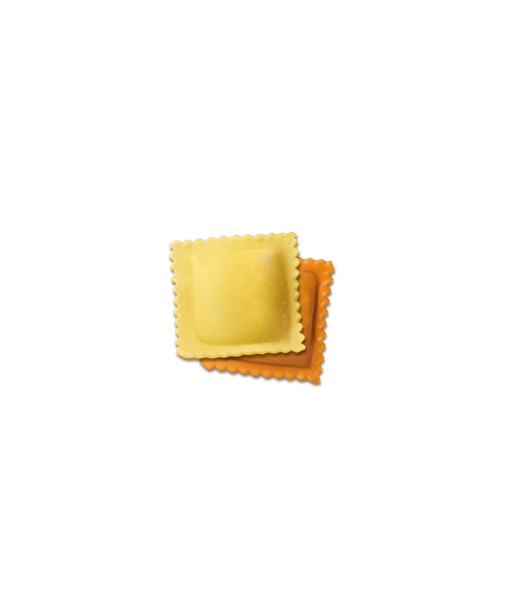 Pasta (50%): semola di GRANO duro, UOVA da allevamento a terra (20% sulla pasta; 10% sul totale), farina di GRANO tenero, acqua, sale. Pasta rossa con aggiunta di concentrato di pomodoro (6% sulla pasta). Ripieno (50%): mozzarella di LATTE di bufala (LATTE di bufala, sale, caglio) (30% sul ripieno; 15% sul totale), pomodori pelati (23% sul ripieno; 11,5% sul totale), pangrattato (farina di GRANO tenero tipo "0", lievito di birra, sale), formaggio Edamer, olio di oliva, sale, origano, conservante: E200. Spolvero con farina di riso.